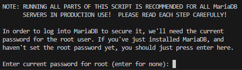 sudo mysql_secure_installation 명령을 실행하면 초기 설정을 아래와 같이 나온다.